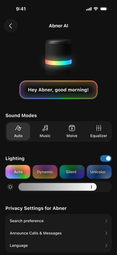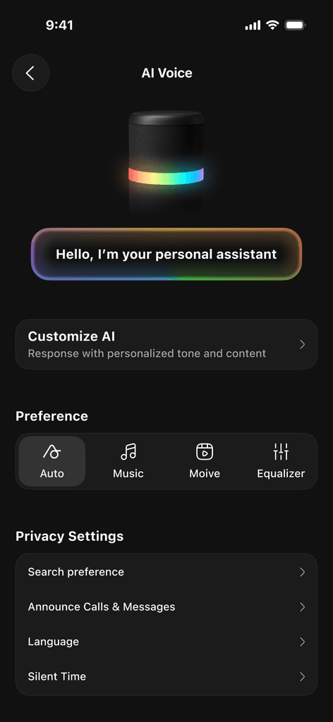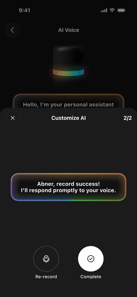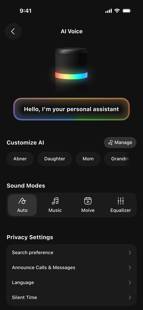 Besides, users can customize AI preference for each family member in the app. Through individual voice model record, the AI adapts its tone, light effects, and content filtering — like shielding children from inappropriate content.