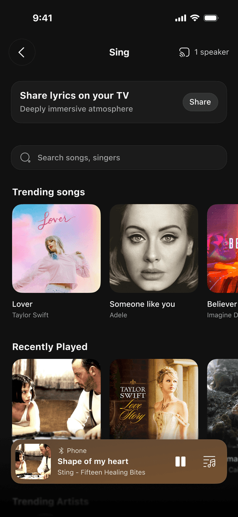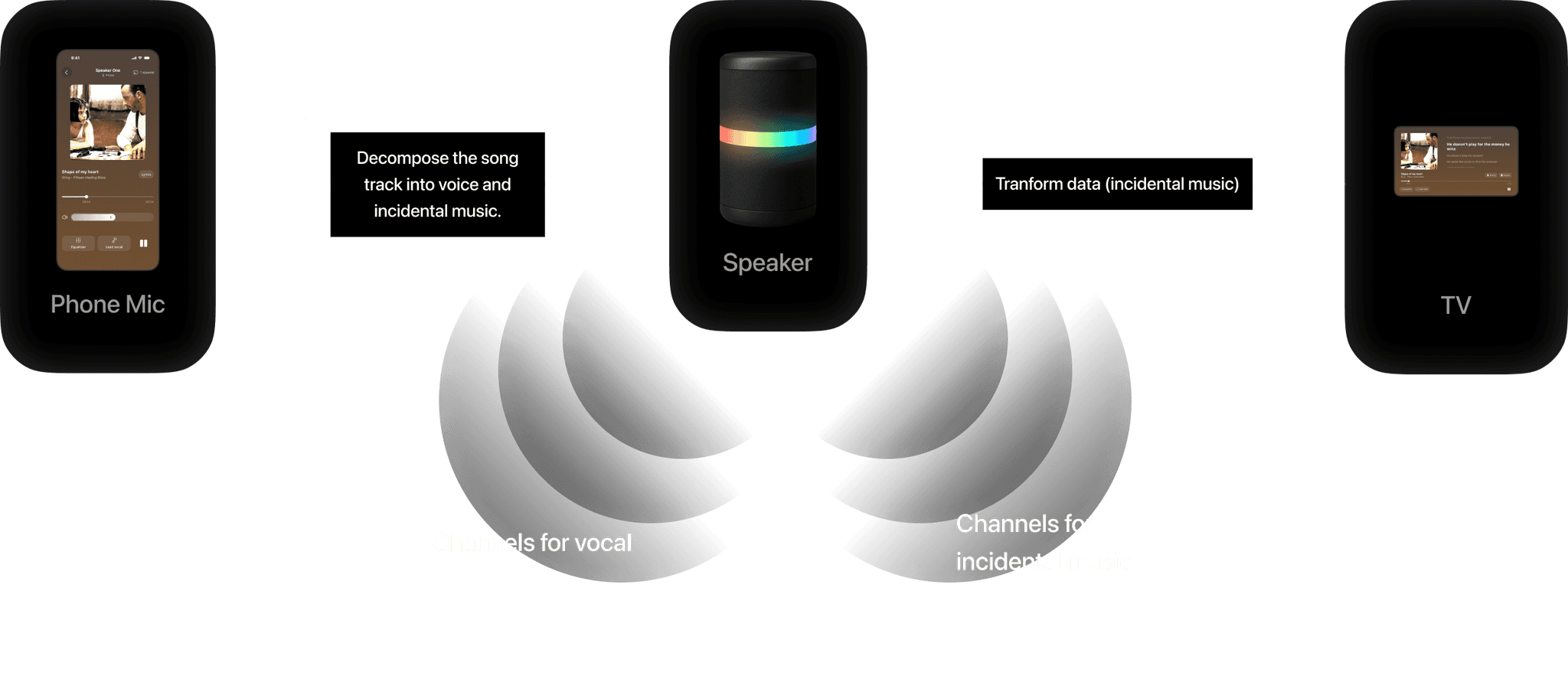 User voices captured by the smartphone mic are transmitted to the speaker for playback, while song metadata is relayed to the TV for display.